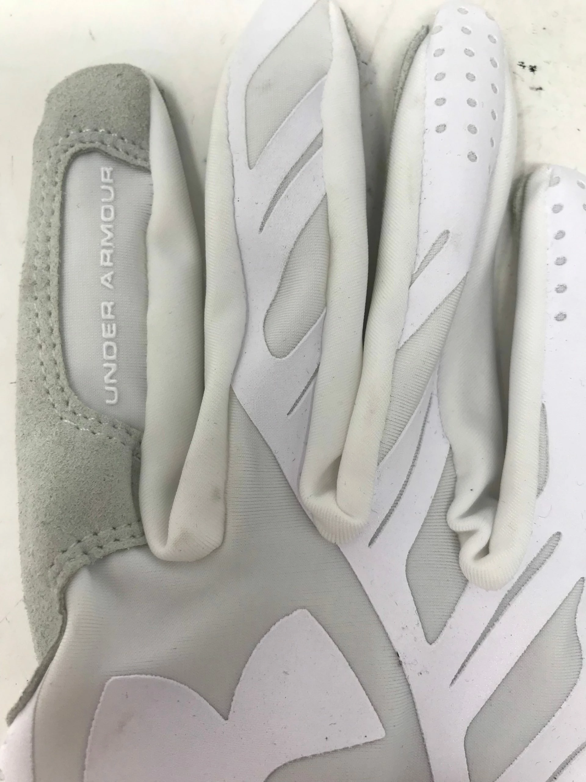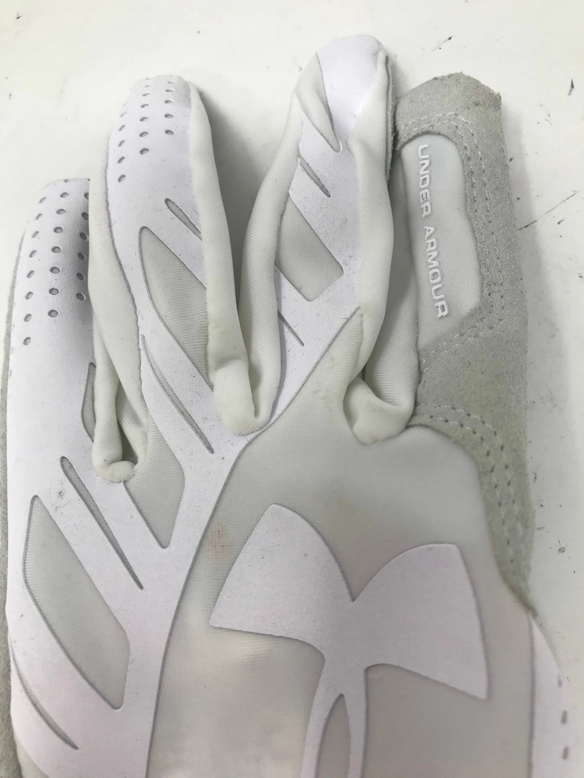 SKU: 1279665668132 Category: Softball Tags: Condition: Used - Small faint stains on both gloves. Snags on left glove. See pics!, Feed-cond-used, Size: Large, Softball, White/White